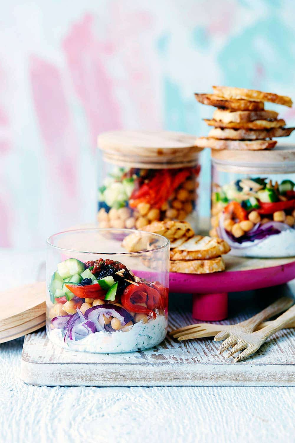 4. Spoon the yoghurt mixture into 375-ml jars. Top with salad and a spoonful of harissa dressing.