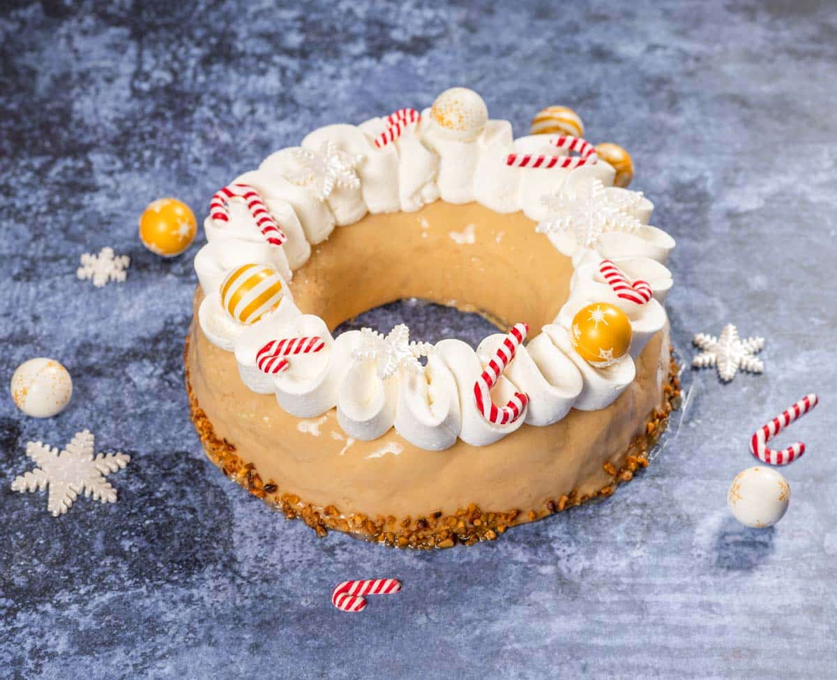 2. Assemble the cake in successive layers of biscuits and buttercream, lightly soak the biscuit with coffee. Spread buttercream all around and decorate with a beautiful wave of vanilla whipped cream.