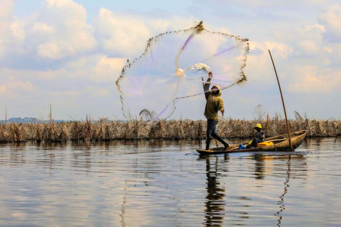 Lentement, artistiquement, avec une gestuelle précise exécutée des milliers de fois, debout sur sa pirogue, le pêcheur béninois lance son épervier (filet) sur le lac Nokoué. De la minutie du pliage du filet, de l’adresse de son lancer, de son approche sans bruit dépend la réussite de la prise. Lesté, le filet s’enfonce rapidement dans l’eau saumâtre. Les mailles se resserrent. Pris au piège, les poissons frétillent et atterrissent dans la pirogue.