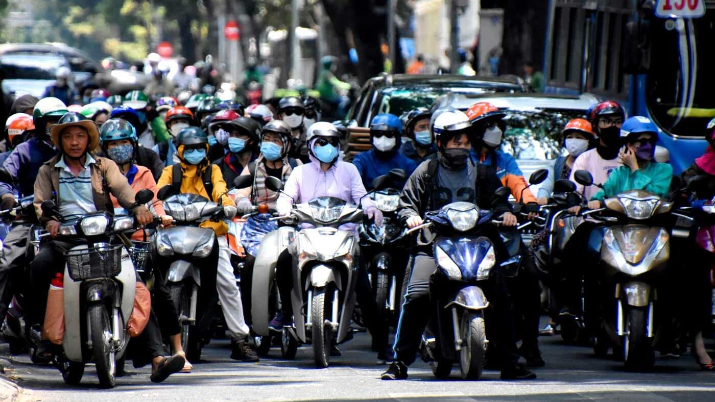 L’économie prospère à Saïgon, comme on nomme encore souvent cette cité de dix millions d’habitants qui a été la capitale du Viêtnam jusqu’en 1975. Ici, tout au sud du pays, l’économie qui se privatise de plus en plus n’est pas à la seule à se développer. Près de sept millions de deux roues (et la tendance va croissant) évoluent dans le centre-ville, chargés de familles entières ou d’objets encombrants tels que des réfrigérateurs, des échelles ou des bouteilles de gaz. Leurs klaxonnements incessants dominent le paysage urbain et saturent l’atmosphère.