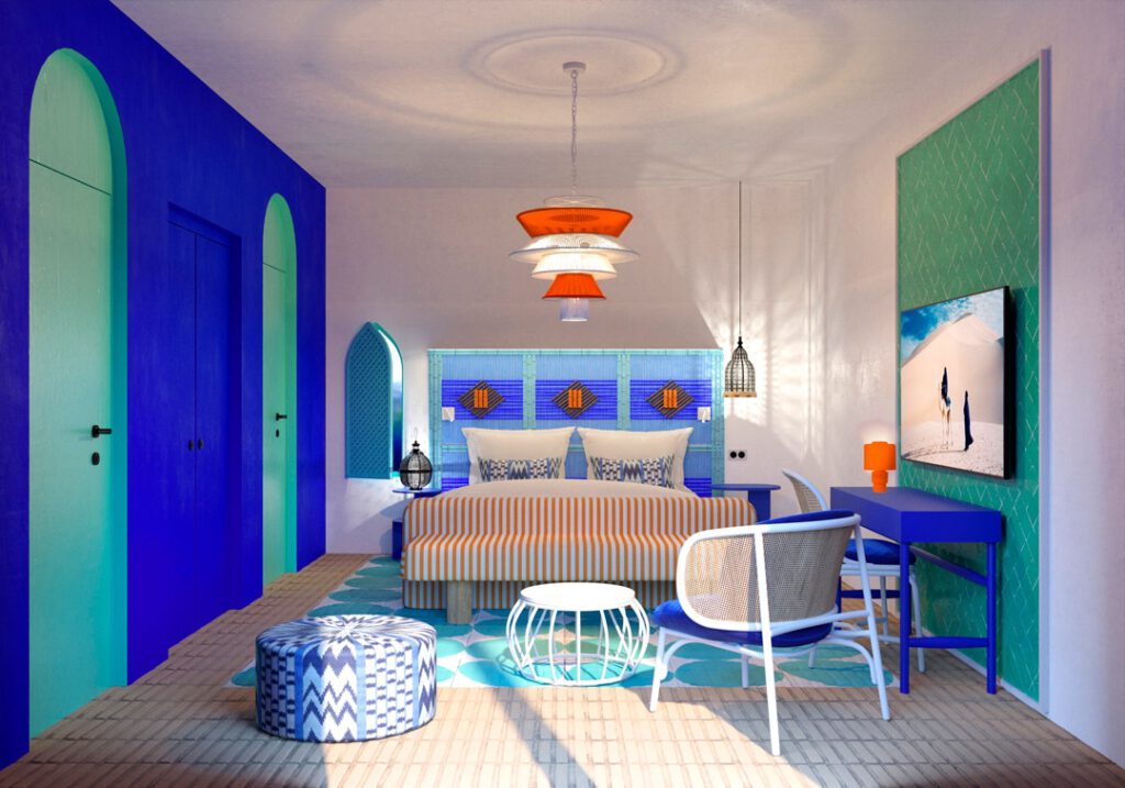Inaugurées cette année, les nouvelles chambres familiales du Club Med reprennent les couleurs du Jardin Majorelle. © Club Med