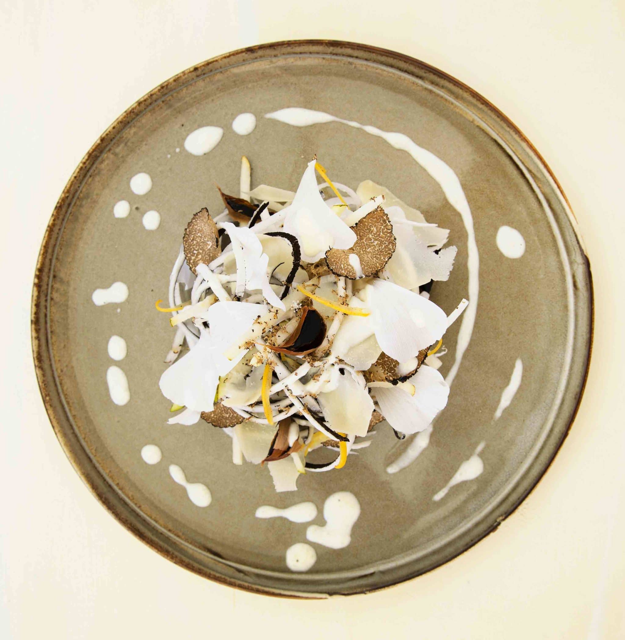 3. Mettre les spaghettis dans un faitout, ajouter le beurre, la truffe hachée (garder quelques tranches pour le dressage), mélanger.