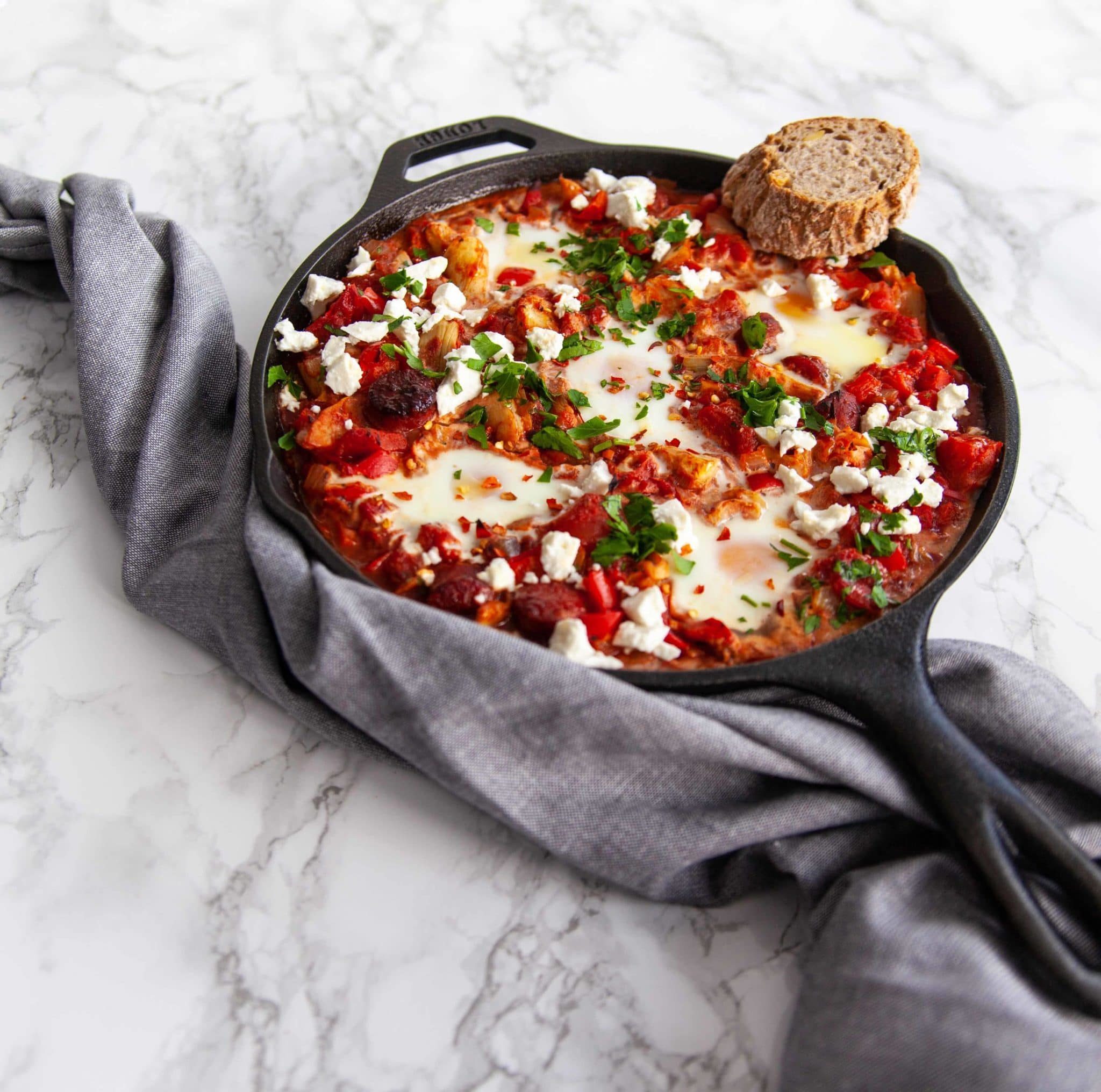 3.Heat the olive oil in a 25 cm cast iron pan over medium heat. Add the onion, garlic, red pepper, artichoke hearts and diced Mettwurst and simmer gently for approx. 5-10 minutes until soft.