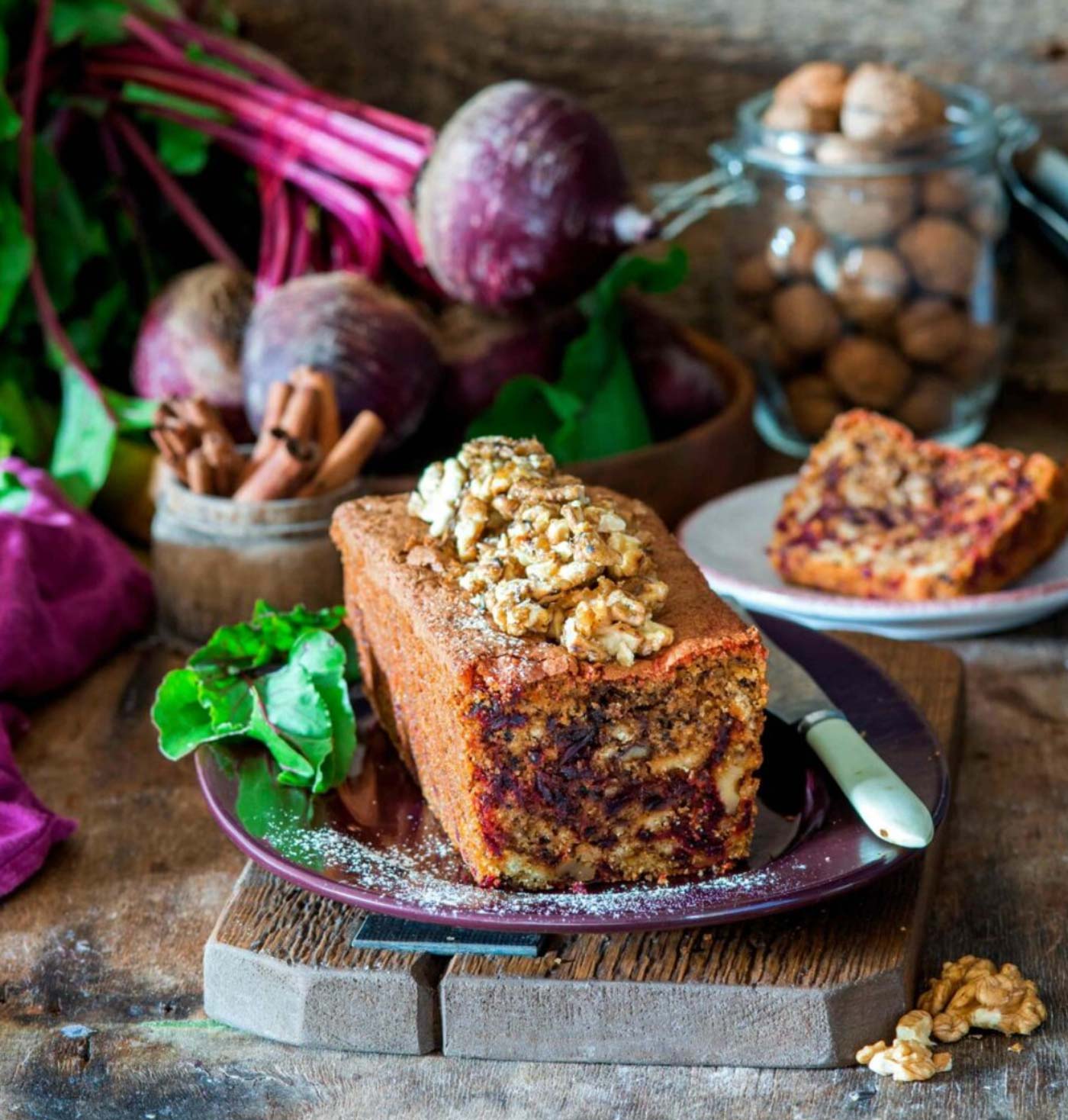 3. Mix the soft butter with the sugar, vanilla sugar, and salt until creamy. Gradually stir in the eggs one by one. Mix the flour with the baking powder and the spices and fold in with the ground walnuts. Add the beetroot cubes, half of the chopped walnuts, and the chocolate drops. Stir everything briefly and add some milk if necessary.