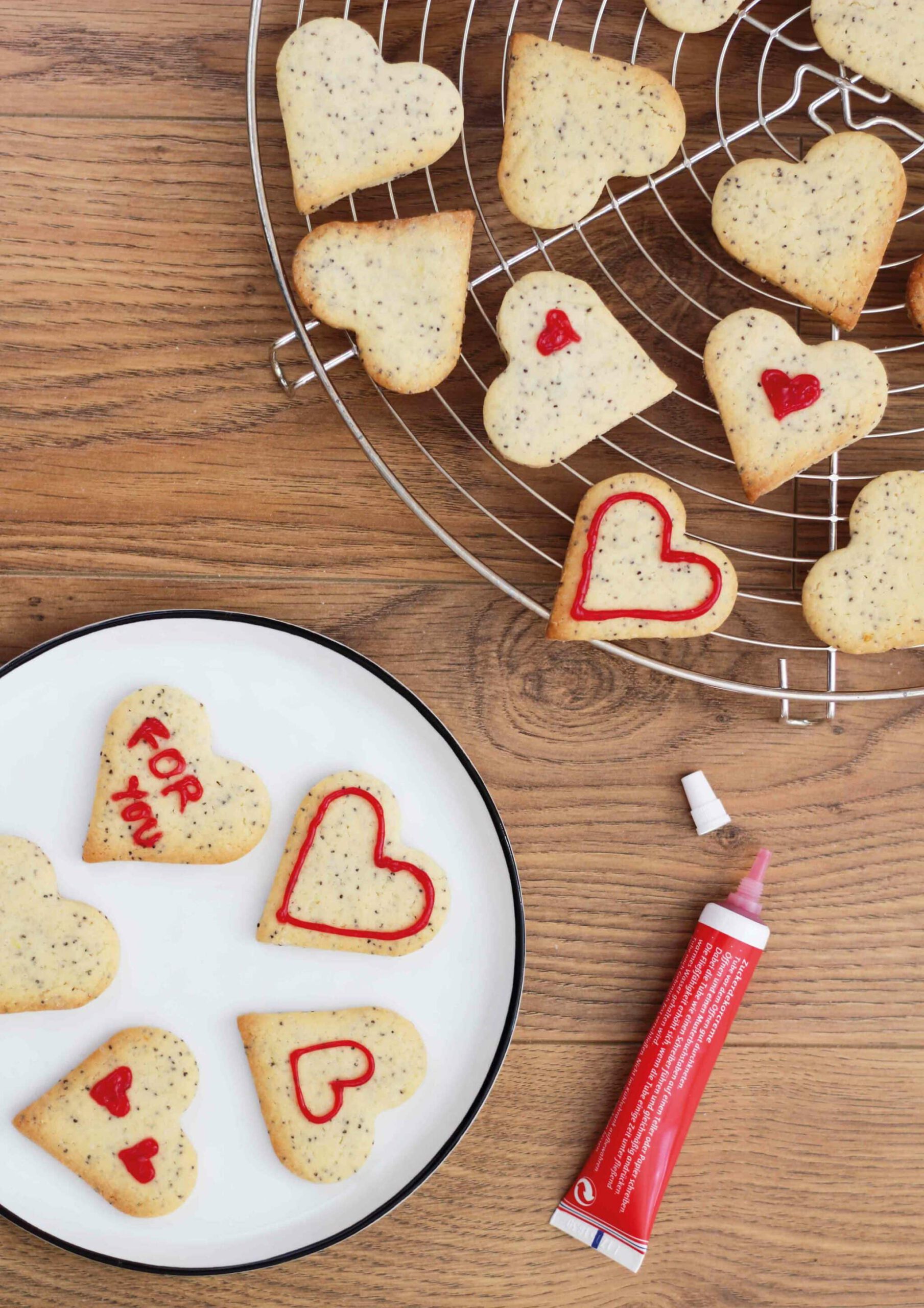 5. Spread 3 tablespoons of the cream cheese mixture on top of the biscuit base in the muffin tins. Place 2 raspberry dots on top and pull the tip of a toothpick through each to form a heart.