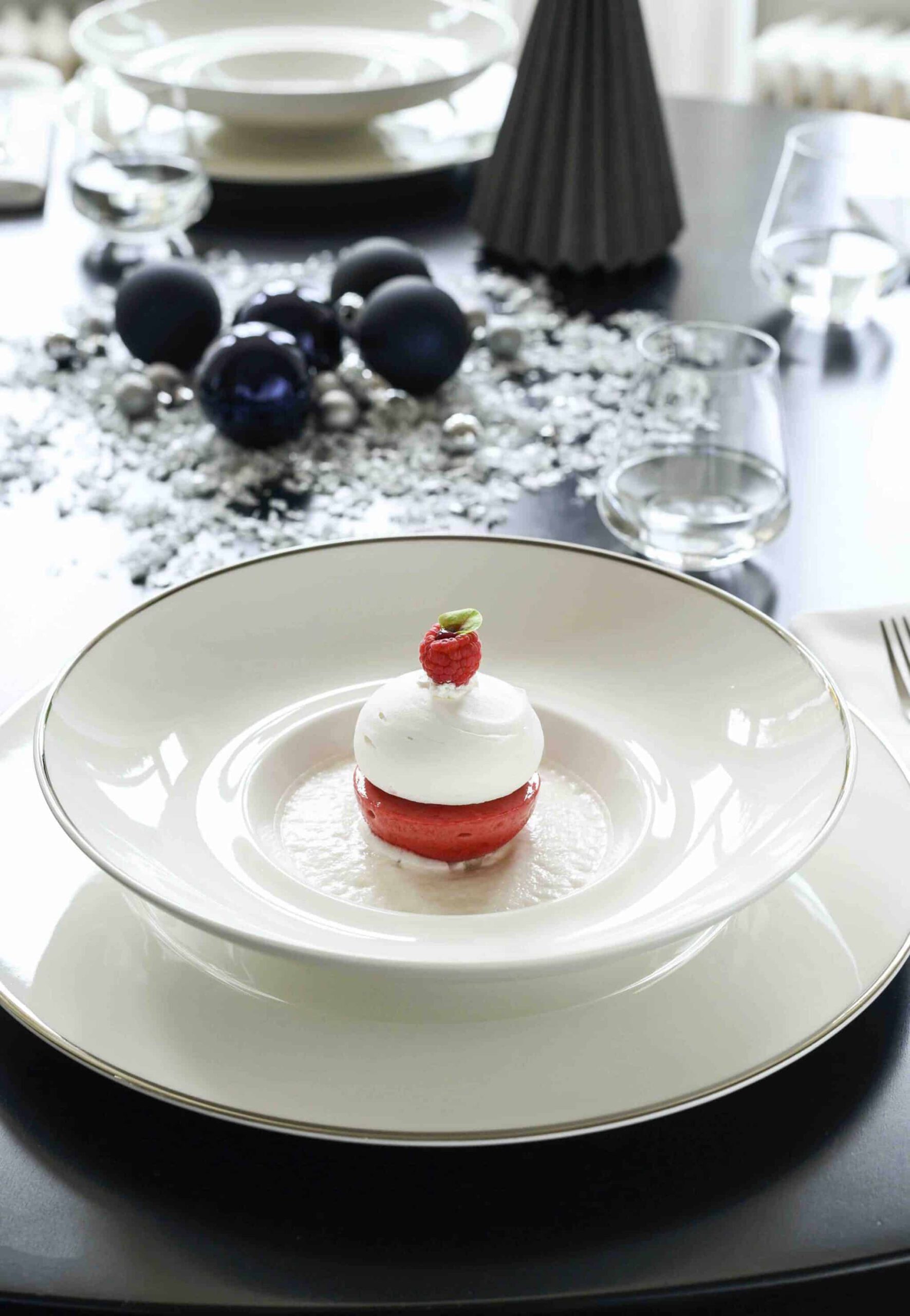 Put a cloud of foam (espuma) on the plates then place a half-sphere of raspberry ice cream on top. Top with a meringue and garnish with straw- berry coulis and a few baby leaves.