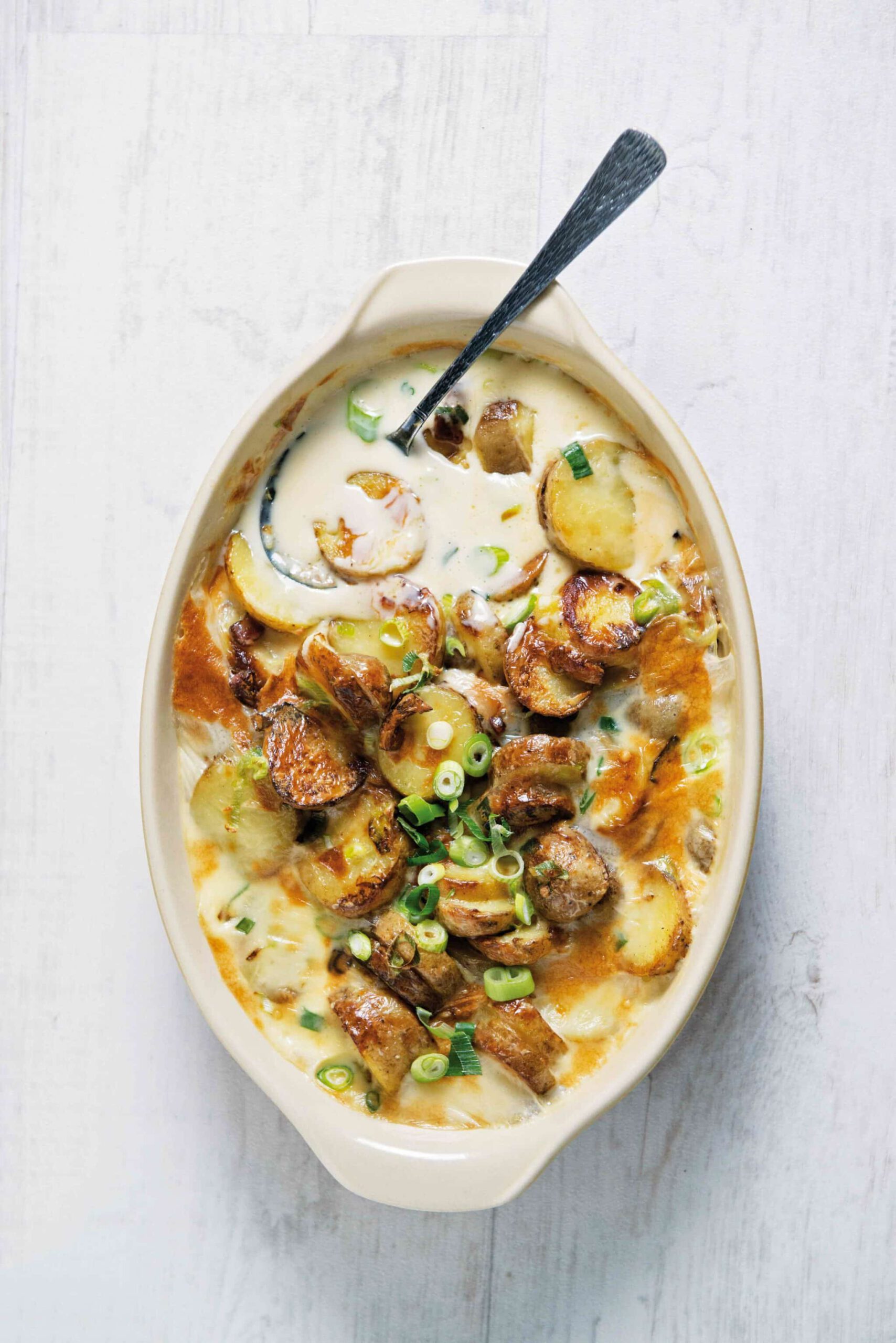 - 1 ½ kg waxy potatoes2 bunches spring onions200 g natural Kochkäse, 40 % fat 50 g bacon cubes1 tablespoon of oil4 tablespoons of creamsalt and pepper