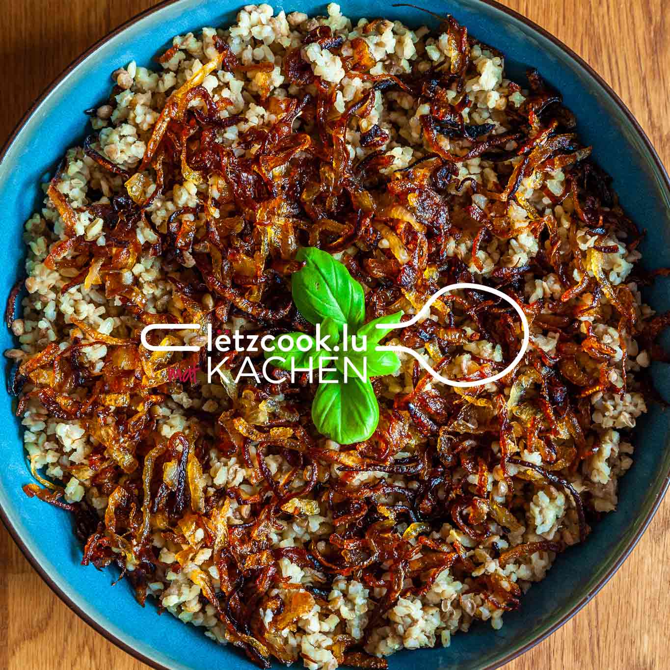 - 225gr/8oz/1 cup green lentils350gr/12oz bulgur wheat, rinsed30ml/2 tablespoon olive oil750ml/3cups waterSalt and black pepperTo serve:3 big onion thinly sliced6 tablespoons mild olive oilSalt