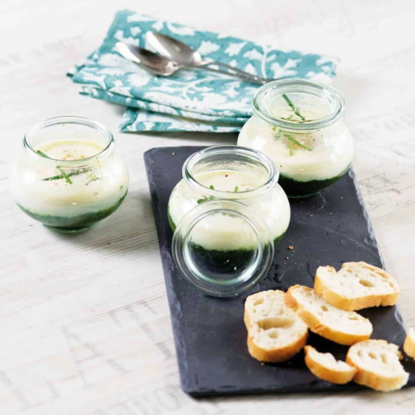 3. Butter the fireproof moulds (cocottes). Put a tablespoon of spinach in each pan. Beat the eggs and arrange one spoon per dish on the spinach. The egg yolk must remain whole.