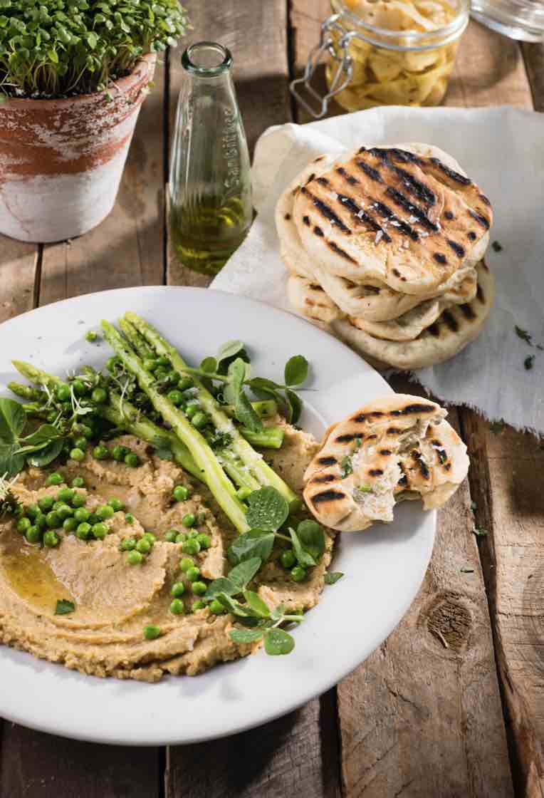 5. To serve, place the hummus on a plate and top with the blanched asparagus spears and peas. Garnish with pea shoots and serve alongside the flatbreads as a shared snack.