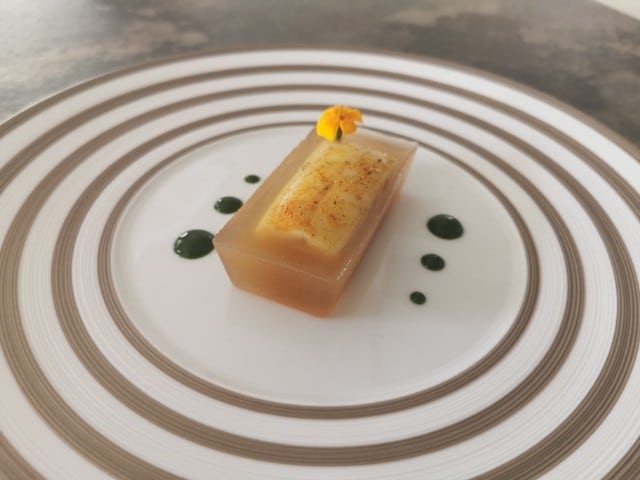 3. Soak the gelatine leaves in cold water and then add them to the hot verjus. Arrange the pike fillets in the bottom of the previously selected moulds and pour the verjuice just warm.