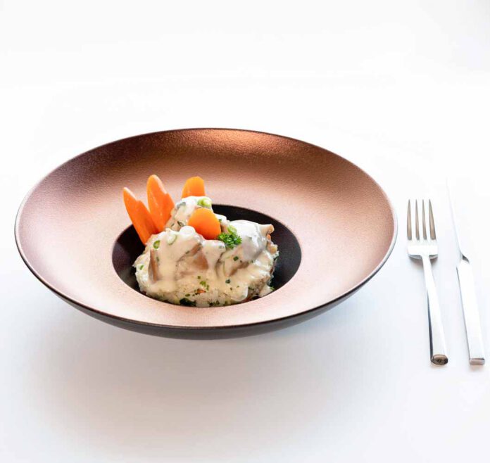 4. In a frying pan, melt a knob of but- ter and sauté the mushrooms for 5 – 10 minutes with a little water and the lemon juice. Season with salt and keep warm. When the meat is cooked, keep it warm and collect the broth by passing it through a strainer or sieve. Melt 70 g of butter over low heat and add the same amount of flour to make a roux. Stir well until the butter is absorbed and the roux colours slightly. Add the stock 3 or 4 times, whisking until the first broths. Then add the Kachkéis mixed with the egg yolk and whisk vigorously. Adjust the seasoning and add the pieces of meat to the sauce. Serve with rice and vegetables.