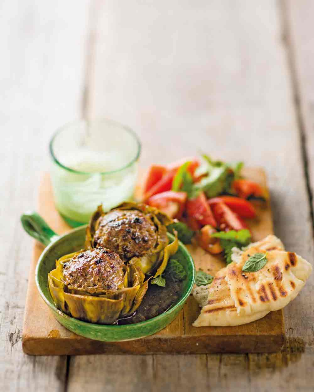 6. Remove from oven, distribute the artichokes in bowls or deep plates with some of the cooking juices, garnish with mint and serve with pita bread on the side if desired.