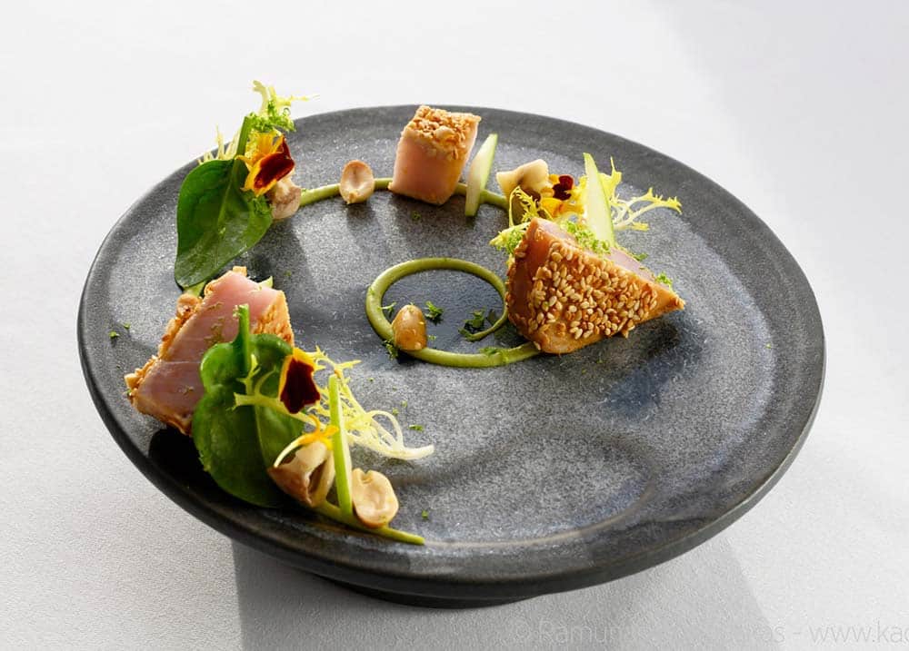 Swordfish Tataki with turmeric, toasted sesame, salad and avocado cream