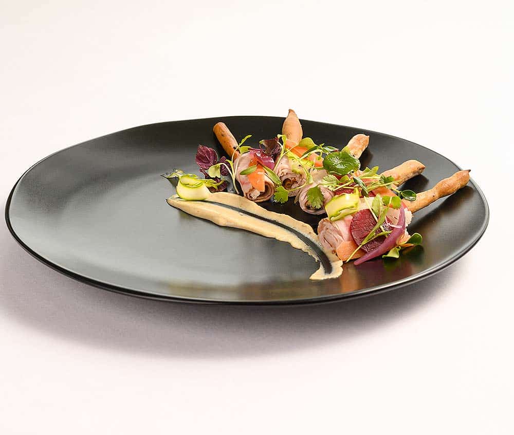 - 20 Grissini sticks, 10 cm (if possible with olives, or plain)400 g shank of veal without fat1 onion3 g ground pepper2 garlic cloves, crushed10 black olives50 g white wine1 bay leafsome thymesome rosemaryolive oilTonnato sauce:100 g tuna in brine2 eggs, medium soft boiled35 g capers3 or 4 anchovy fillets40 g olive oil2 tbsp balsamic vinegarsaltpeppercooking brothVegetables