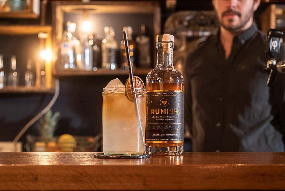 Open the RumISH. Place a funnel in the 0.5l bottle of RumISH and pour three tsp of the 5 Spice spice mix (or your own mix) into the bottle. Tightly close the bottle and leave it upside down overnight. To prepare, filter 6 cl of Spice Infused RumISH through a coffee filter and set aside.Â