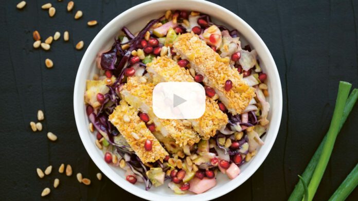 - Distribute the salad evenly in 4 bowls. Cut the chicken into small pieces and place them on top of the salads. Garnish with pomegranate seeds and pine nuts. Finally drizzle the leftover dressing over each bowl.Â
