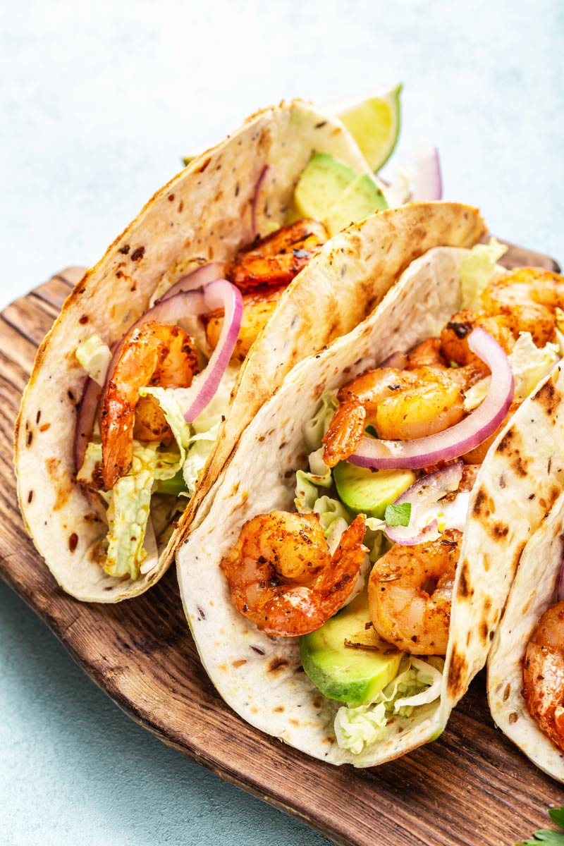 5. Your shrimps are now ready for assembly. For the best tacos add avocado, onions, salad and lime juice with the shrimps in toasted corn tortilla bread.