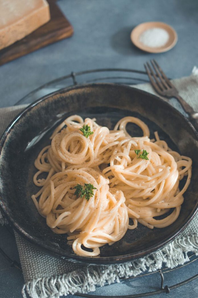 - In the same pan, bring the parmesan with the cream and water to the boil until it has melted completely. Add the pasta and mix well. Remove the pot from the heat.