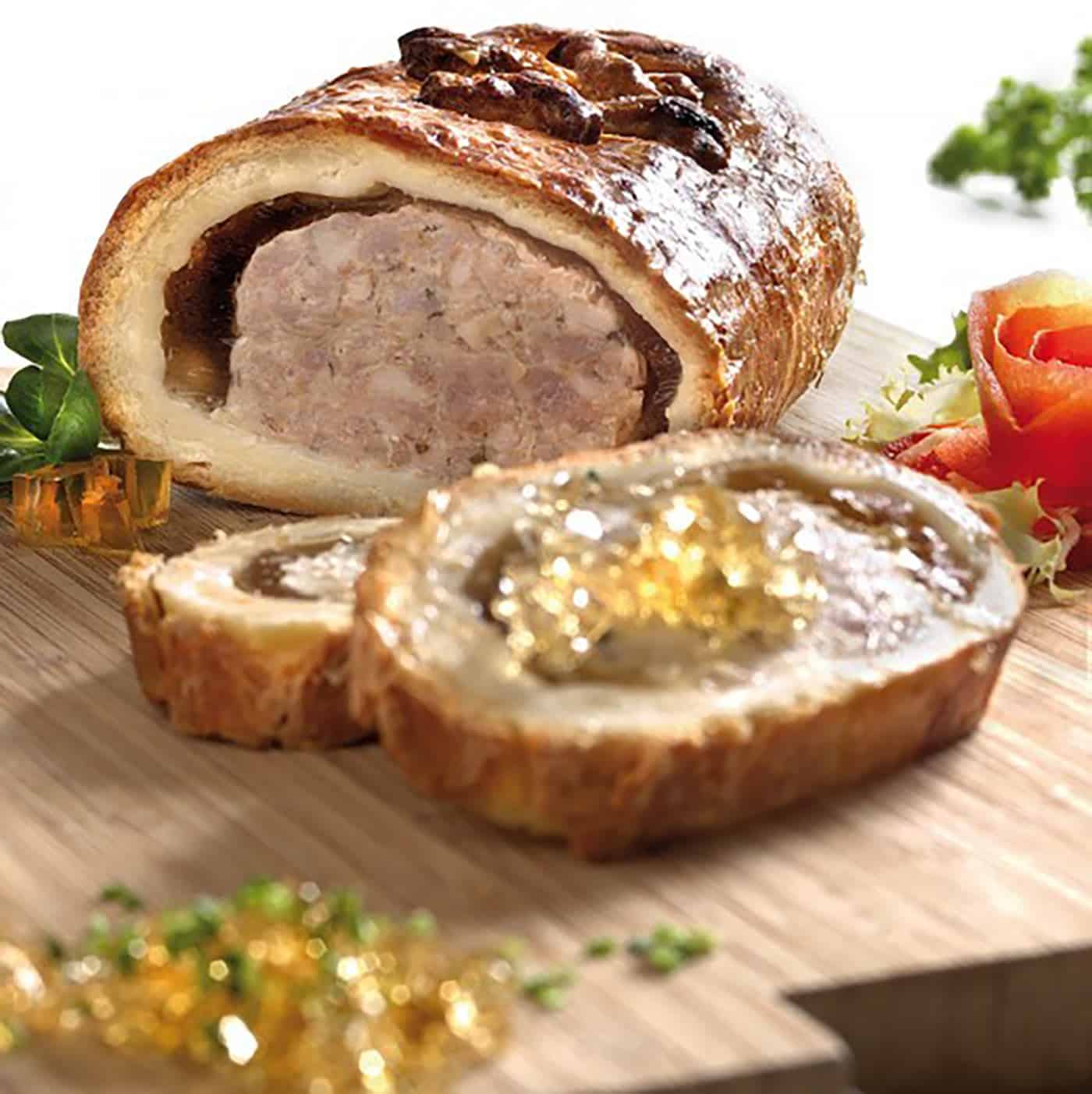 - Remove the pâté from the oven, leave to cool slightly and slowly pour in the Riesling jelly through the top holes.