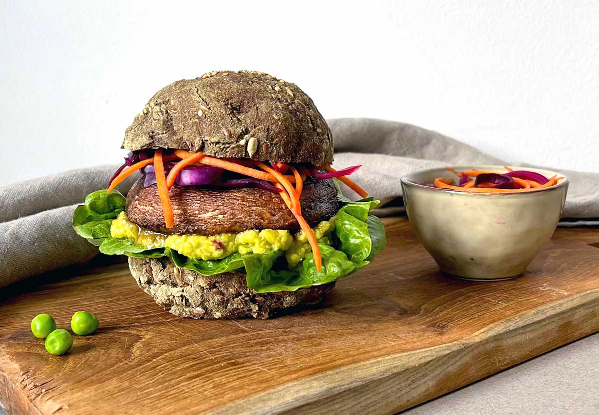 - Spread the inside of the buns with the wasabi purĆ©e and top with the grilled portobello mushrooms and coleslaw. Top with cucumber slices, lettuce, radishes and sesame seeds as desired and finish with a Sriracha mayo.Ā