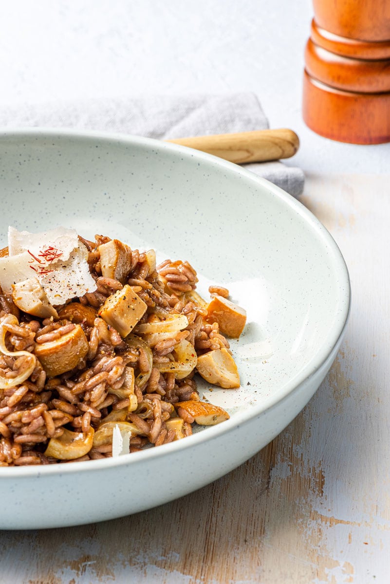 - Shortly before the end of the cooking time, stir in the saffron threads, the diced butter and the porcini mushrooms and season to taste with salt and pepper.
