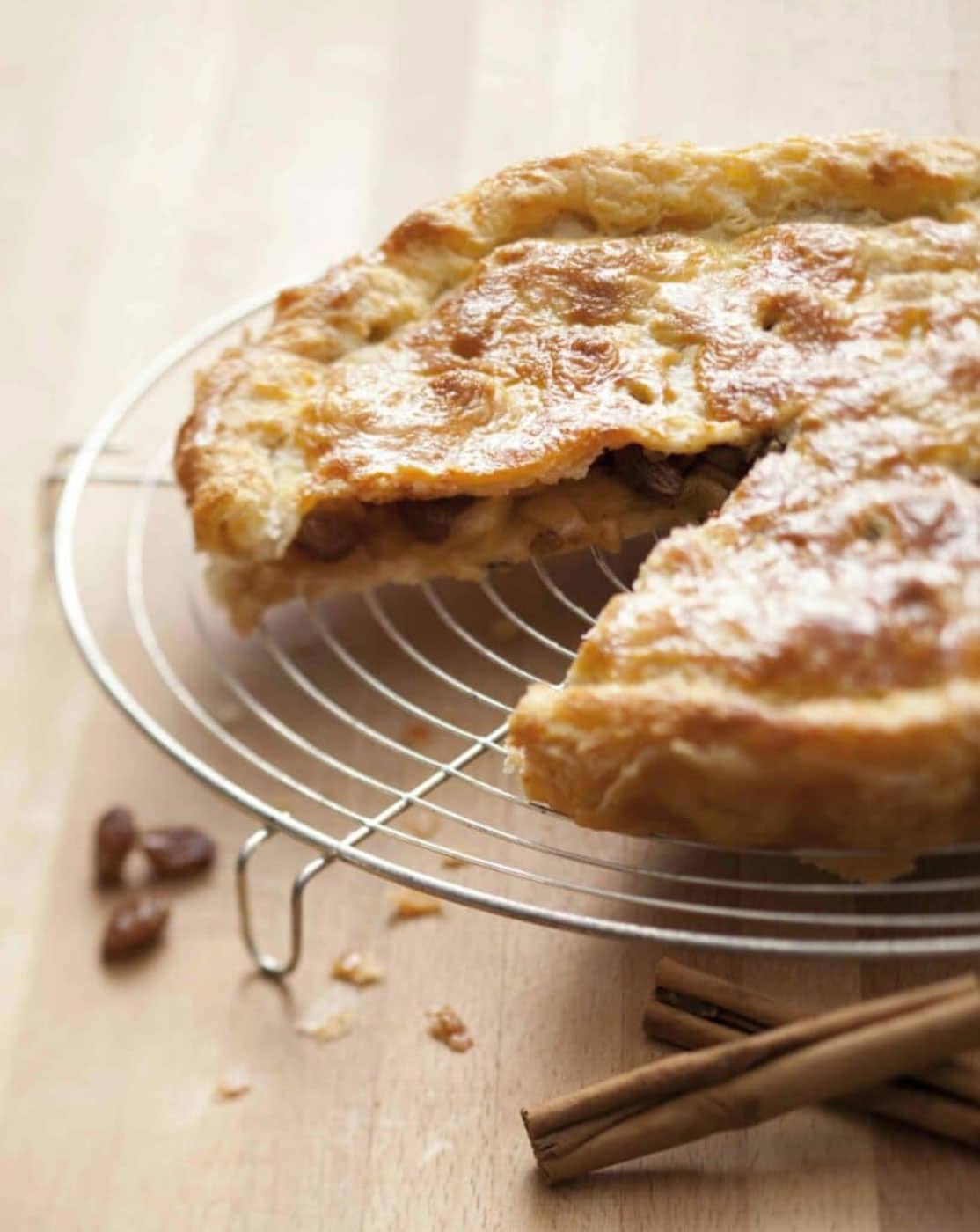 Divide the dough into two halves and roll it out into two large circles on a well floured surface with the help of a dough roller. Line a greased cake tin with a layer of dough, place the apple pieces and raisins on top and sprinkle with cinnamon and brown sugar. Place the second layer of dough as a "lid" on top and press both layers of dough together all around with some egg yolk. Spread the rest of the egg yolk on the top of the dough and make some decorative holes in it (this allows the steam to escape during baking and prevents the dough lid from bursting open). Bake for 30 to 40 minutes at 180°C and enjoy lukewarm.