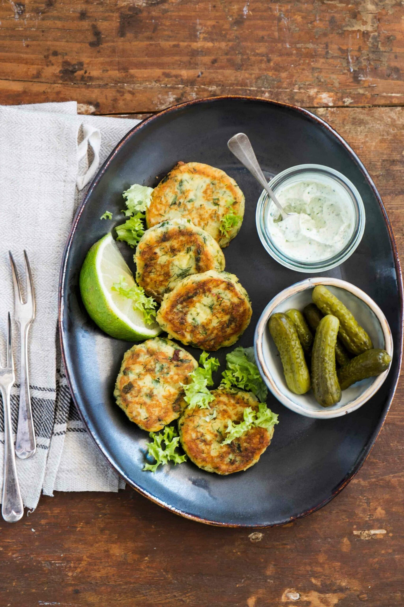5. In a hot, coated pan heat butter with oil; add dollops of dough with wooden spoon. Fry for approx. 5 minutes at medium heat, flip and fry for a further 5 minutes on other side until gold- en brown. Fry all patties in this way. Let dry on kitchen towel and serve, for example, with a herb dip.