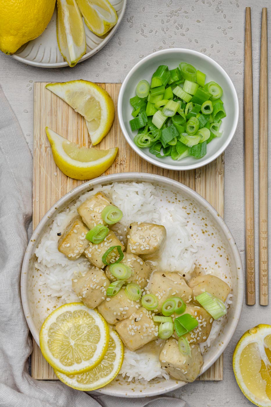- For the marinade, mix the corn starch, water and rice vinegar. Pour over the tofu and give it a good stir. Refrigerate for 30 – 60 minutes.
