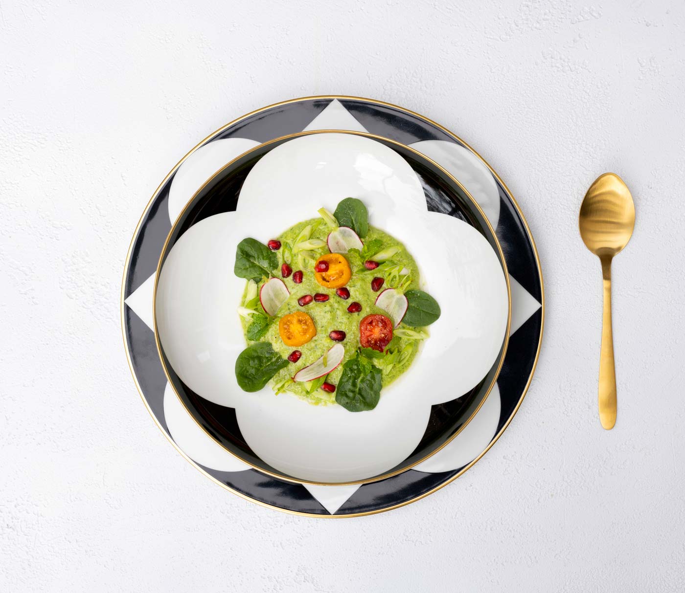 - Place the spinach, garlic, cucumber, seedless chilli, mint, basil, parsley, avocado, spring onions, Greek yoghurt, coconut milk, olive oil, lime juice, salt and pepper in the bowl. Blend for 30 seconds at speed 5, gradually increasing the speed to 10 and adding the water.