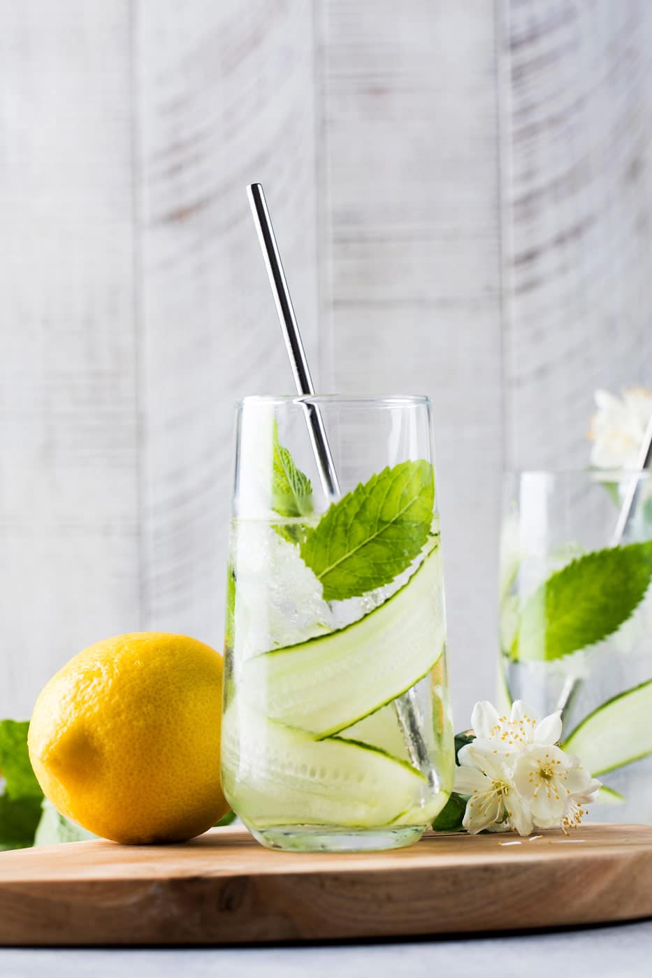 1. In a cocktail shaker, muddle the cucumber slices and mint leaves.