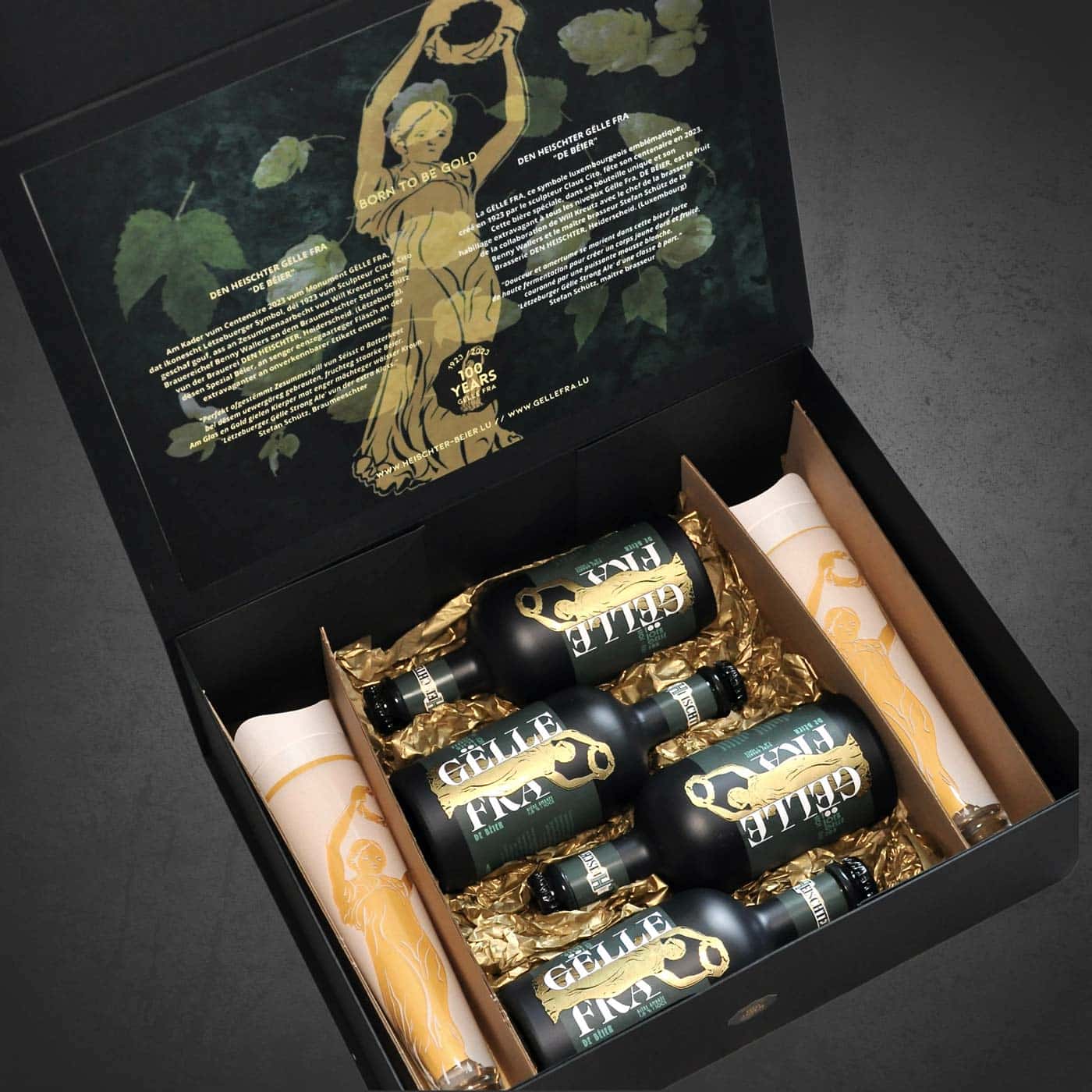 The celebratory beer is bottled in a 0.5 l bottle with an extravagant design inspired by the Art Deco school of the 1920s, which was fashionable during the inauguration year of the “Gëlle Fra”. Thus, the anniversary beer becomes a piece of living history, a pleasure that enlivens the senses and strengthens the memory of the symbolic spirit of our national monument, preserving it for future generations.