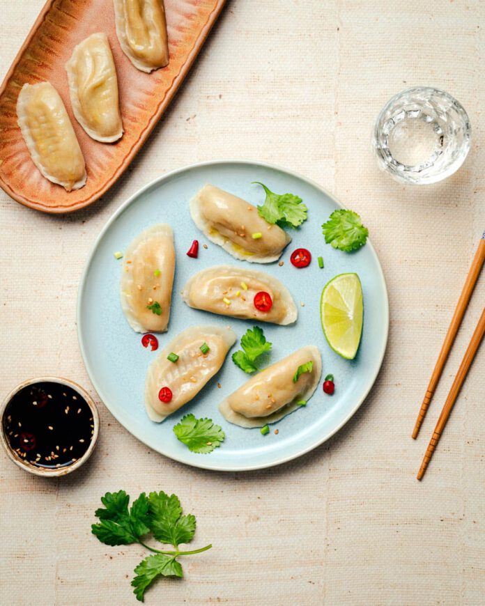 until all the liquid has evaporated. - Serve the gyozas with a spicy soy and coriander sauce.