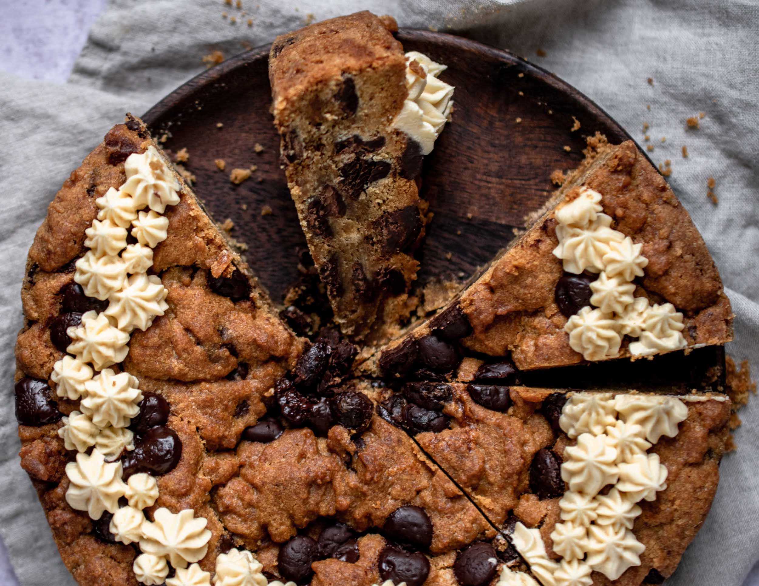 • Allow the cookie cake to cool in the pan before removing. Let the cookie cake fully cool, transfer to a serving plate and decorate with the speculoos buttercream.