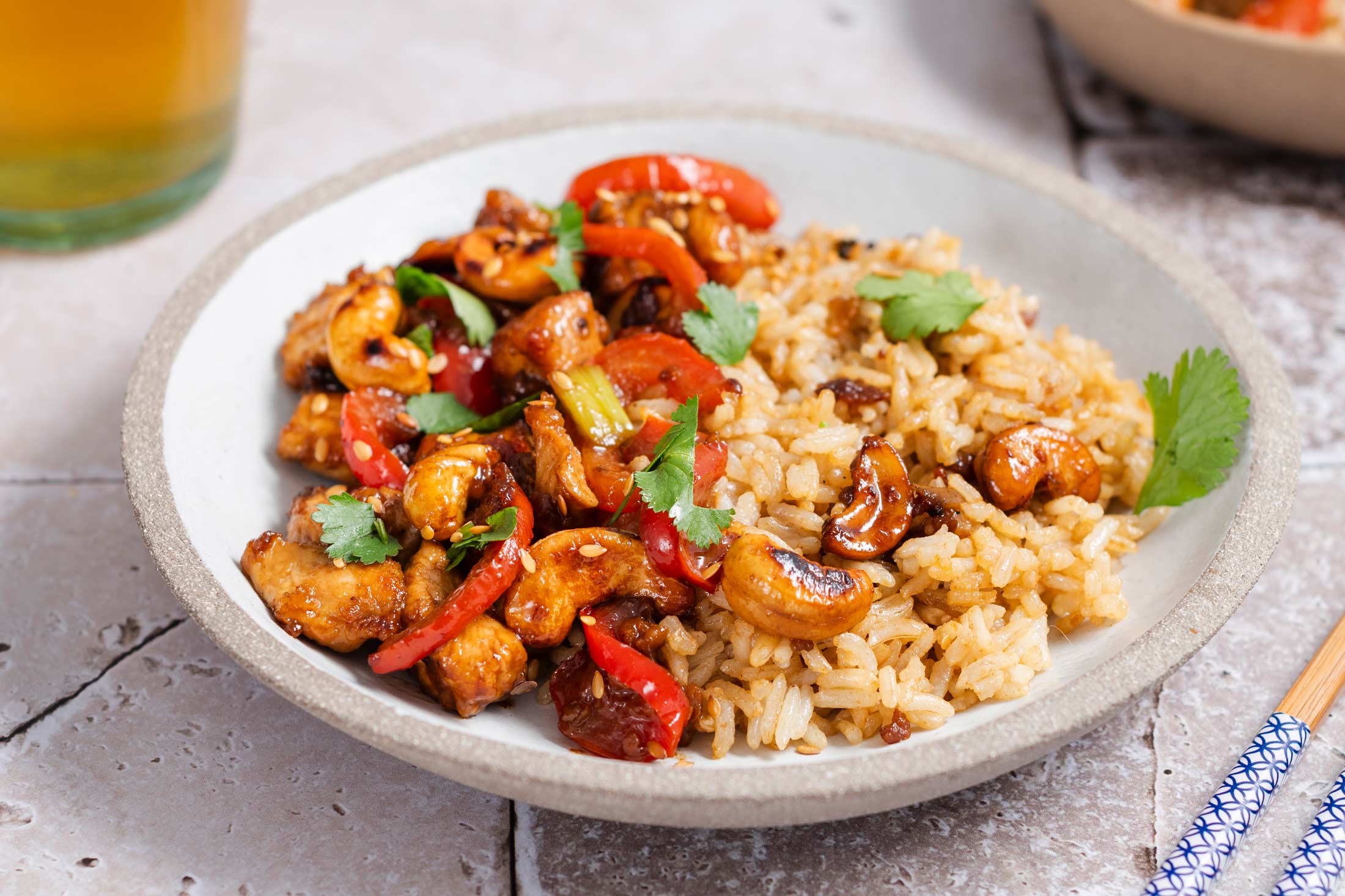 - In a hot pan, fry the meat with 3 tbsp oil over a high heat for 5 minutes. Add the peppers and continue cooking for 2-3 minutes. Sprinkle with cashew nuts, mix, add the onion and sauce and cook for a further 30 seconds. Serve with rice.
