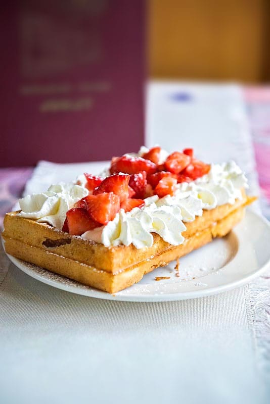 7. Mit Puderzucker bestäuben und mit Schlagsahne und Erdbeeren oder Kirschen garnieren.