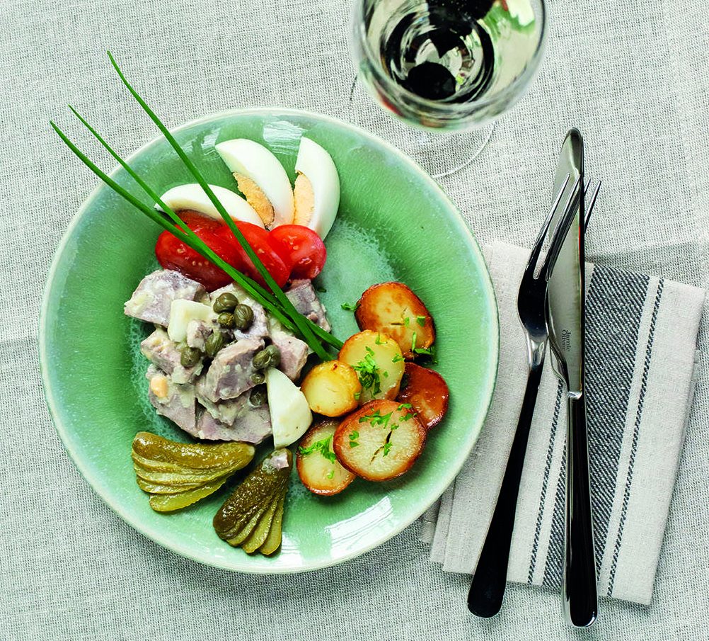 6. Den Fleischsalat auf einem Teller anrichten und mit den Tomaten und Eiern dekorieren (Eier und Tomaten können auch vorsichtig unter den Salat gehoben werden). Schnittlauch und frische Kräuter darübergeben und mit warmen Bratkartoffeln servieren.