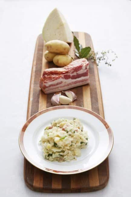 3. In der Zwischenzeit die Speckwürfel in etwas Gänsefett oder Butter anbraten und zusammen mit dem Bratfett zur Kohl-Kartoffel-Mischung geben. Mit Petersilie bestreuen und alles gut miteinander vermischen (am besten mit dem Kartoffelstampfer zerdrücken).