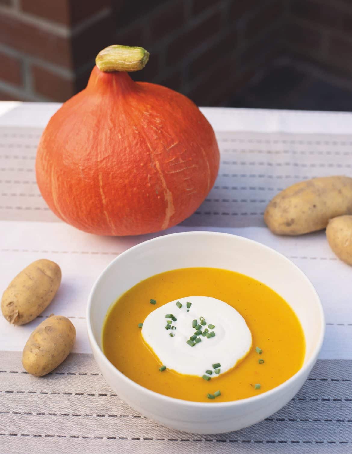 5. In Suppentellern mit Sauerrahm oder aufgeschlagener Sahne sowie Brot-Croûtons und Kürbiskernen servieren.