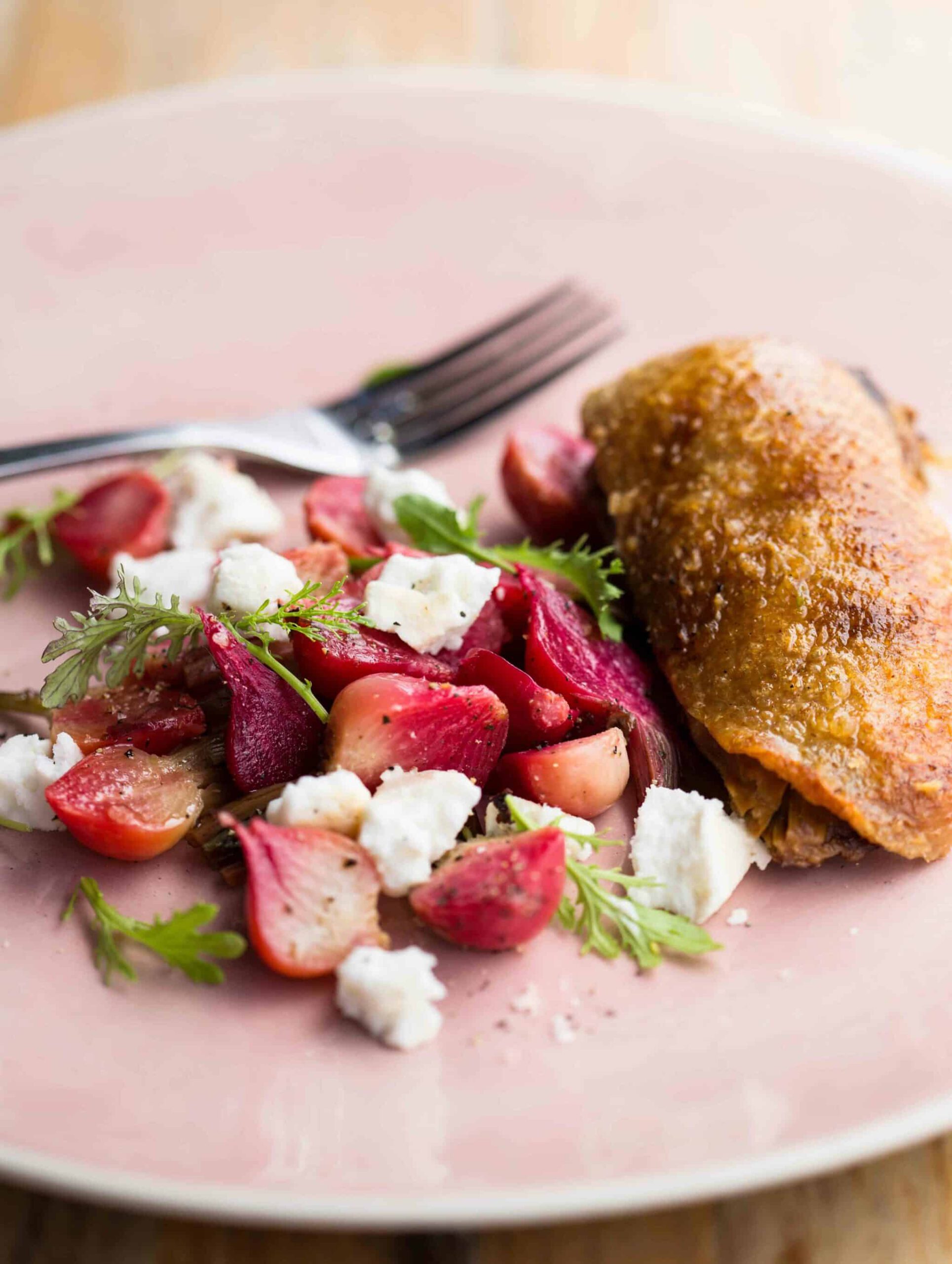 5. Vor dem Servieren den Ofengrill auf 220 °C erhitzen. Die Entenstücke auf oberster Stufe im Ofen grillen, bis die Haut knusprig ist. Mit dem Baby-Rüben-Käsesalat servieren.