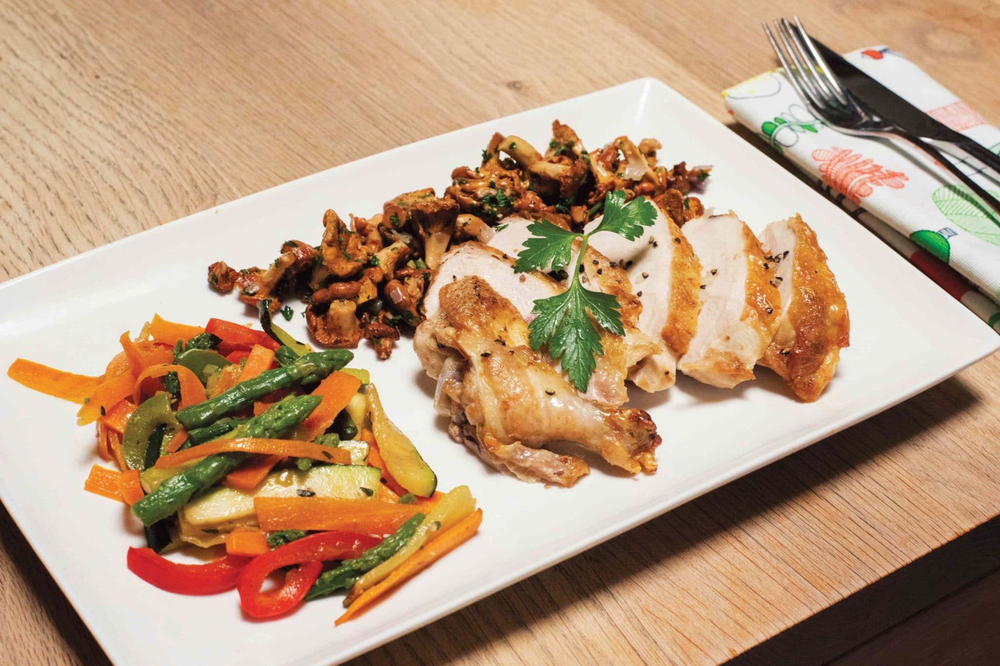 6. Die Pfifferlinge auf einer Platte anrichten, die Poularde in drei oder vier Stücke schneiden und auf die Pfifferlinge legen. Gemüsemischung dazugeben und servieren.