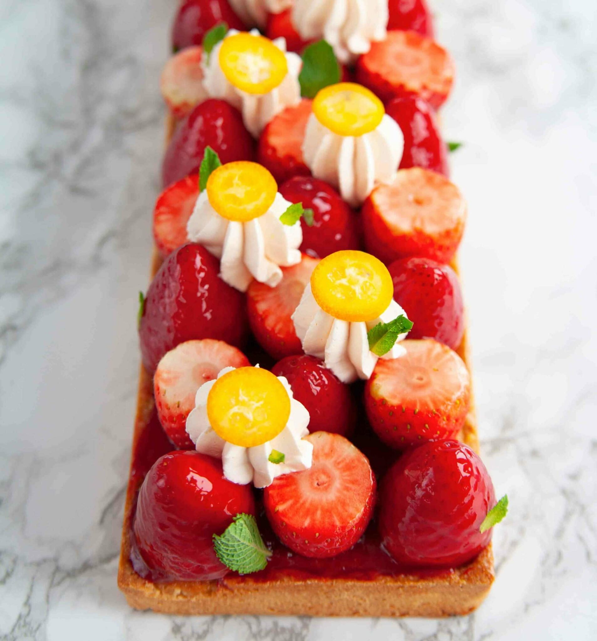 Die Erdbeeren in das Erdbeergelee tauchen, damit sie glänzen. Auf den Kuchen legen und mit kleinen Schlagsahne-Punkten dekorieren. Mit Kumquatscheiben und frischer Minze verzieren.
