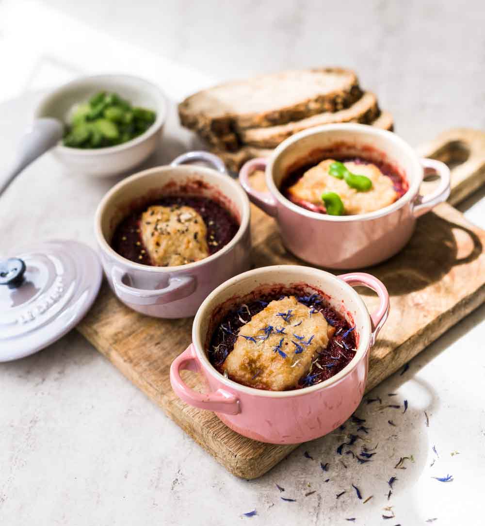 4. Die Rote-Bete-Coulis in den Schmortopf geben und den Schellfisch darauflegen. Mit den Semmelbröseln bedecken und 1 Schnitt Butter darübergeben.