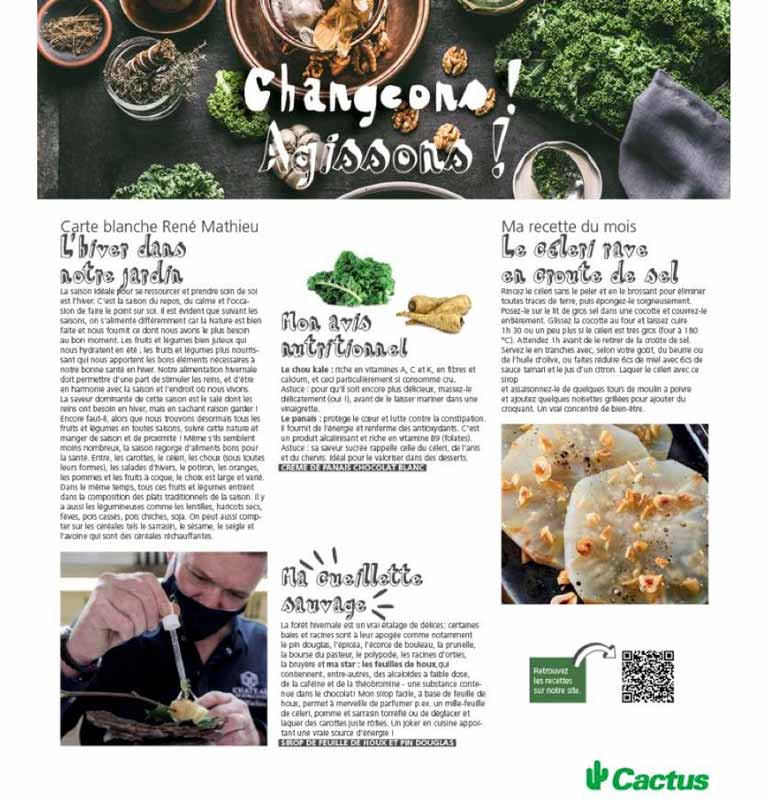 Diese „Cartes Blanches“ sollen dem Verbraucher helfen, etwas zu verändern und selbst aktiv zu werden. In der Tat lautet das Motto dieser neuen Aktion und Philosophie „Let’s change! Lasst uns aktiv werden“. Der Chefkoch wird daher seine Philosophie über Pflanzen durch Ratschläge, Tipps und Rezepte, die auf saisonalen Produkten basieren, teilen. Er wird auch versuchen zu zeigen, wie wichtig es ist, kurze Kreisläufe zu begünstigen, indem man lokal konsumiert und somit die lokale Wirtschaft am Leben erhält. Cactus und René Mathieu werden so zu Verfechtern eines besseren Konsum- und Essverhaltens, sowohl intern mit einer spezifischen Kommunikation für das Cactus-Team als auch mit der breiten Öffentlichkeit dank informativer Beschilderung an den Verkaufsstellen und der „Carte Blanche by René Mathieu“.