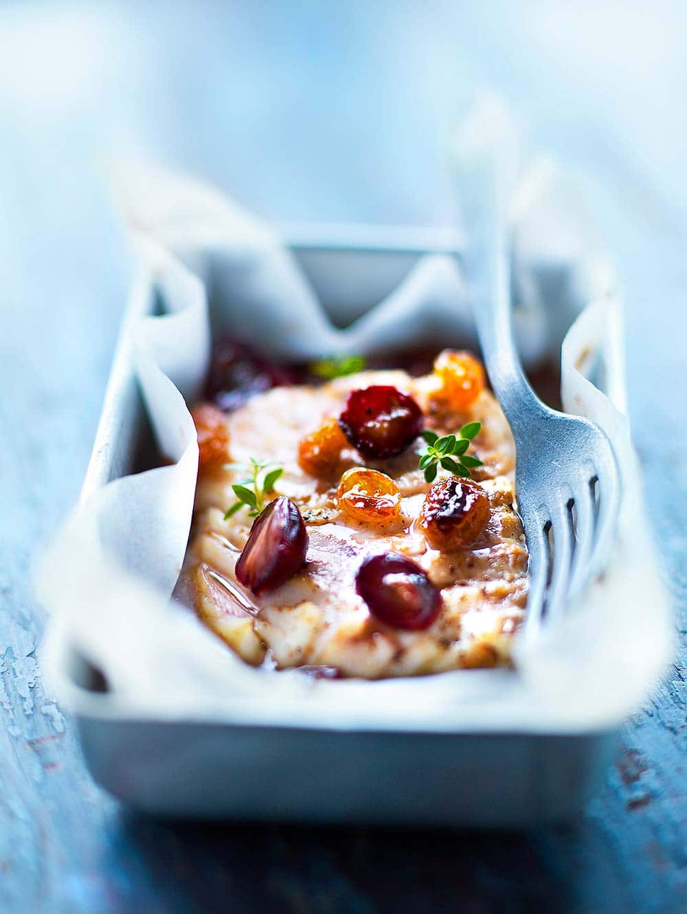 - In jede Papillote einen Kabeljau-rücken, einige Weintrauben und die Rosinen hinzugeben, den Thymian zerbröseln, zwei Stück Butter, sowie 1 EL Traubensaft auf jedes Steak geben. Mit 1 Prise Salz und Pfeffer würzen.