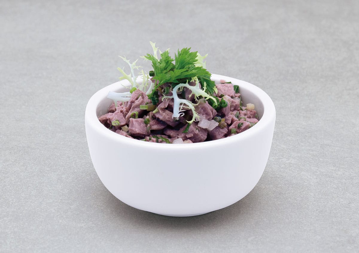 - Dressing mit den gehackten Schalotten, Gurken, der Petersilie und den Fleischwürfeln vermengen.