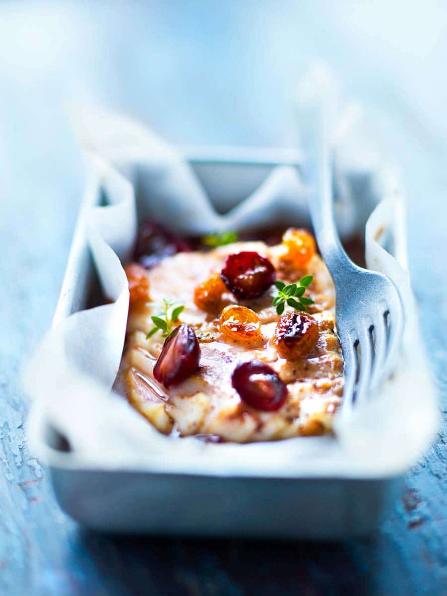 - 4 kleine einzelne Backformen mit Backpapier auslegen, dabei genügend Platz lassen, damit die Ränder überstehen und man das Papier später verschließen kann. Den Boden der Schalen mit weicher Butter bestreichen, den Kabeljau anrichten, mit Pfeffer würzen, dann die Trauben und Rosinen dazugeben, den Thymian zerbröseln; auf jeden Kabeljau zwei Tupfer Butter und 1 EL Traubensaft geben.