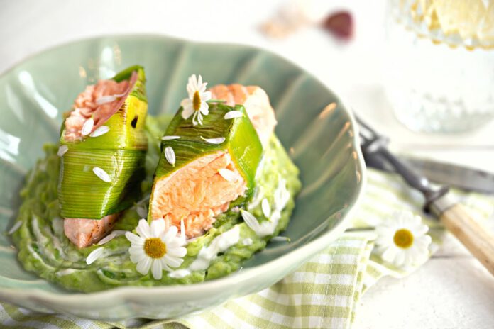 Lachsfilet im Lauchmantel gebraten mit Erbsen-Kartoffelpüree