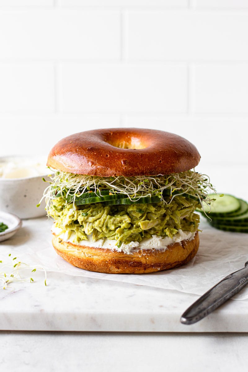 - Die Bagels mit Frischkäse, Avocadocreme und Sprossen belegen.