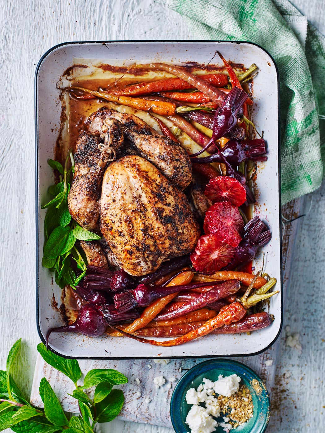 - Das Huhn in eine große Auflaufform legen und ½ Glas Wasser auf den Boden der Form gießen. Danach für 45 Minuten in den Ofen schieben, wobei das Huhn regelmäßig mit dem Bratensaft übergossen wird. Nach dieser Zeit das Gemüse um das Huhn herum legen und mit Blutorangensaft beträufeln. Salzen und pfeffern und erneut für
